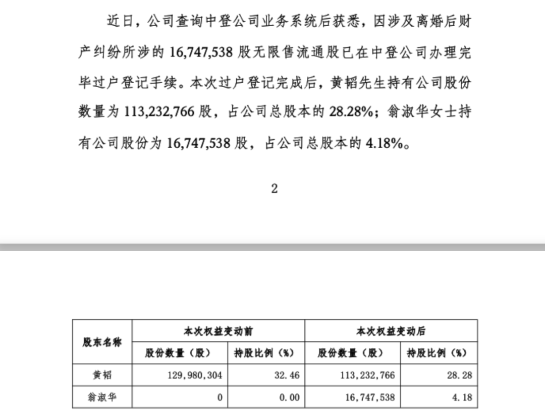 8月21日晚,丽人丽妆发布公告称,实控人黄韬与前妻翁淑华的离婚纠纷所涉股权已完成过户。