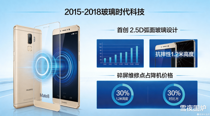 玻璃时代(2015-2018):Mate8首创2.5D弧面玻璃,抗摔性仅1.2米(行业均值),碎屏维修成本占整机价30%。痛点:美学与耐用难以平衡,无线充电效率受限。